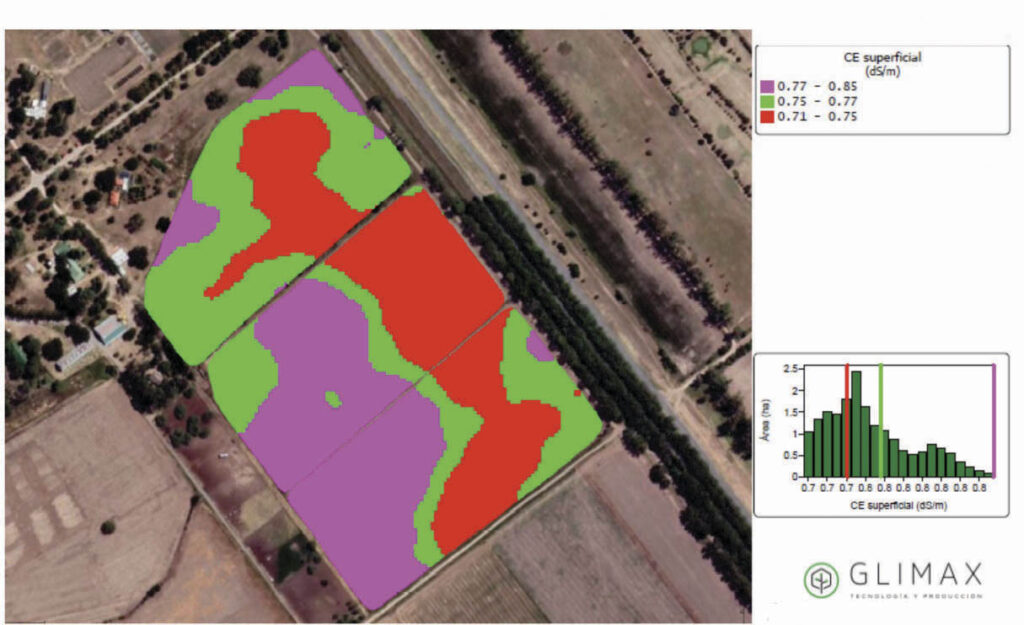 Figura 1. Mapa de conductividad eléctrica superficial del suelo en dS/m. del lote 5 de la EEA INTA Manfredi durante 2023. Confección en base a datos obtenidos con sensor de rastra Falker Terram, elaborado por la empresa GLIMAX.