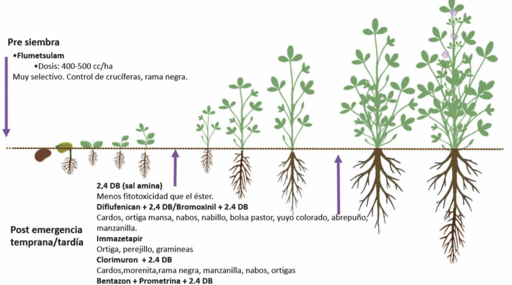 Figura 6. Ciclo del cultivo de alfalfa e intervenciones posibles según el tipo de maleza presente durante pre siembra y post emergencia temprana/tardía. Fuente: Silvia Olivo, 2025.