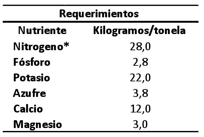 Tabla 1. Requerimiento de principales nutrientes para la producción de materia seca de alfalfa expresado como (Kilogramos/tonelada).