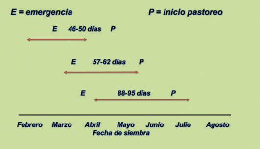 Es un factor importante, por estar directamente relacionado con la rapidez de aprovechamiento y el volumen de producción. Esto puede verse en el esquema a continuación, que presenta los días que transcurren desde la emergencia al inicio de pastoreo según fecha de siembra y para una zona determinada. Según este gráfico, sembrando la avena en febrero se ganan 40-45 días de pastoreo respecto de la siembra de abril.