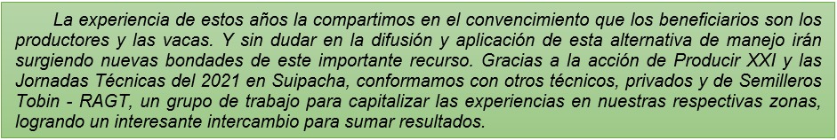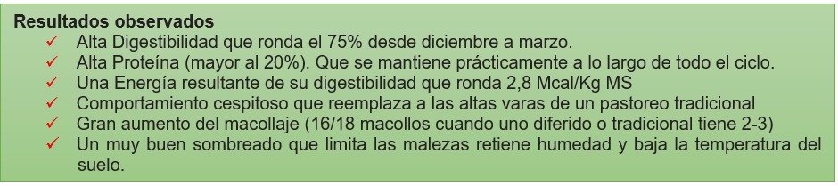 Con solo destinar a este cultivo un 5-10% de la superficie ganadera, dependiendo de la carga animal total, se observan resultados. Es un recurso noble, que siempre responde por su rusticidad y adaptación aún en suelos de regular calidad. Al poder utilizarse con cualquier categoría de hacienda, le otorga una flexibilidad siempre buscada en esta época, y hace muy rentable la inversión que resulta en bajos costo.