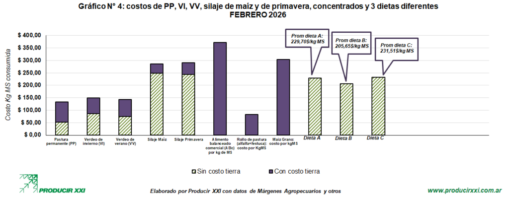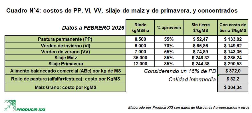 A continuación, se observa el cuadro N°4-A, los costos de las pasturas, verdeos (tanto de invierno como de verano), silaje de maíz y de primavera, concentrados y heno: