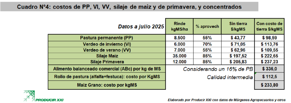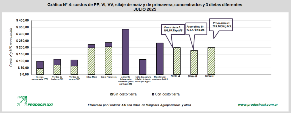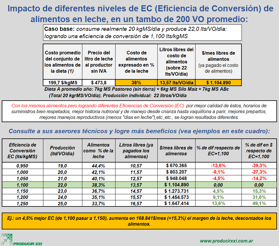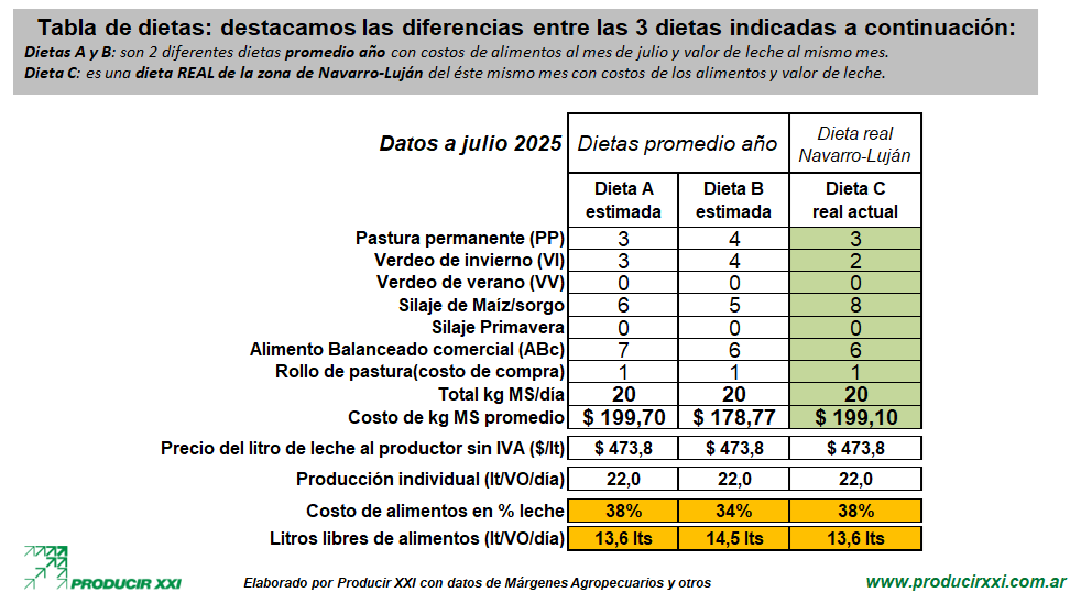 La tabla siguiente, presenta 3 dietas diferentes, las dietas A y B, que siguen siendo promedio año, y la dieta C (nueva implementación) que muestra un caso real de la Cuenca Abasto norte pero ya no promedio año sino la realidad de ese mes para esa zona. Para las tres dietas se aplican los costos de alimentos y el precio de la leche del mes de la publicación, en este caso septiembre 22. Los datos son sacados de Márgenes Agropecuarios, CACF (Cámara Argentina de Contratistas Forrajeros), y de productores zonales.
