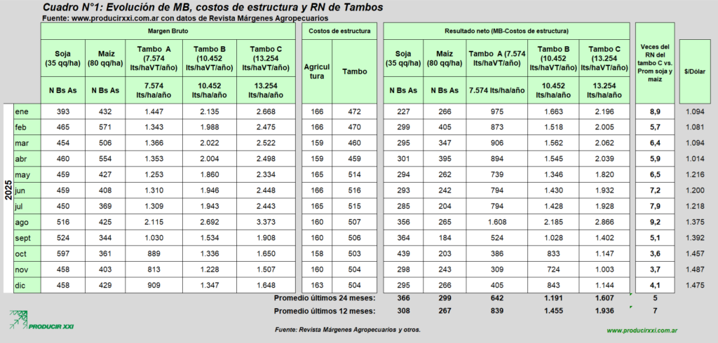Este Cuadro N°1 muestra la evolución del Resultado Neto en dólares/ha (MB – Costos de Estructura) de 2 planteos agrícolas (soja y maíz) y 3 planteos de tambos con diferentes niveles de productividad.