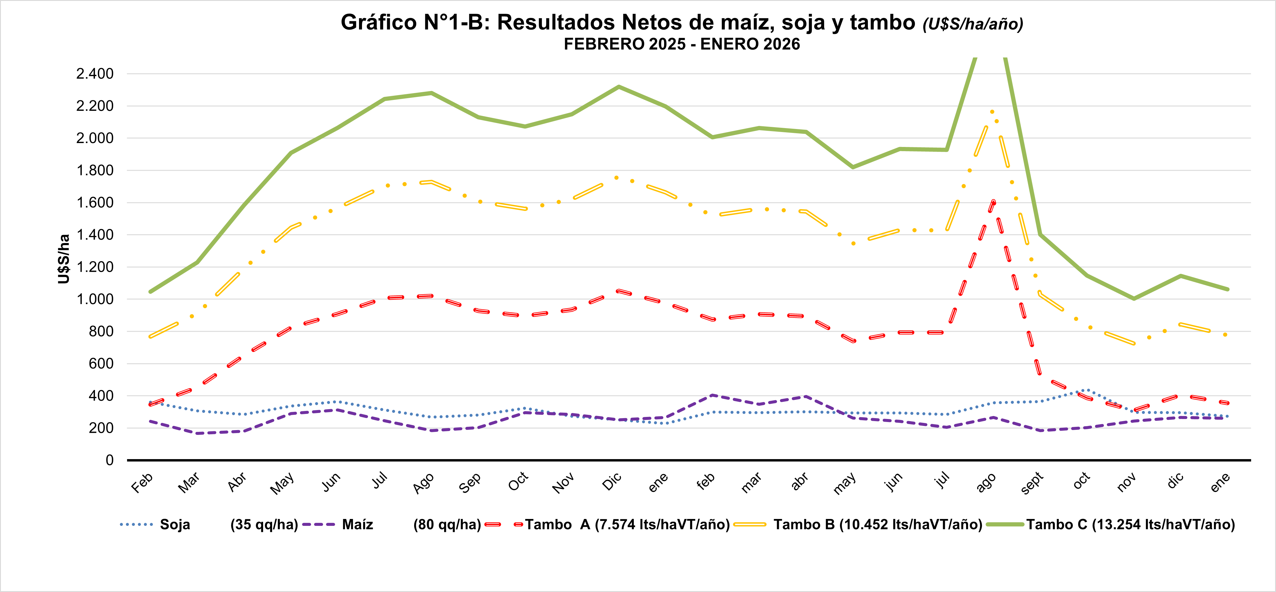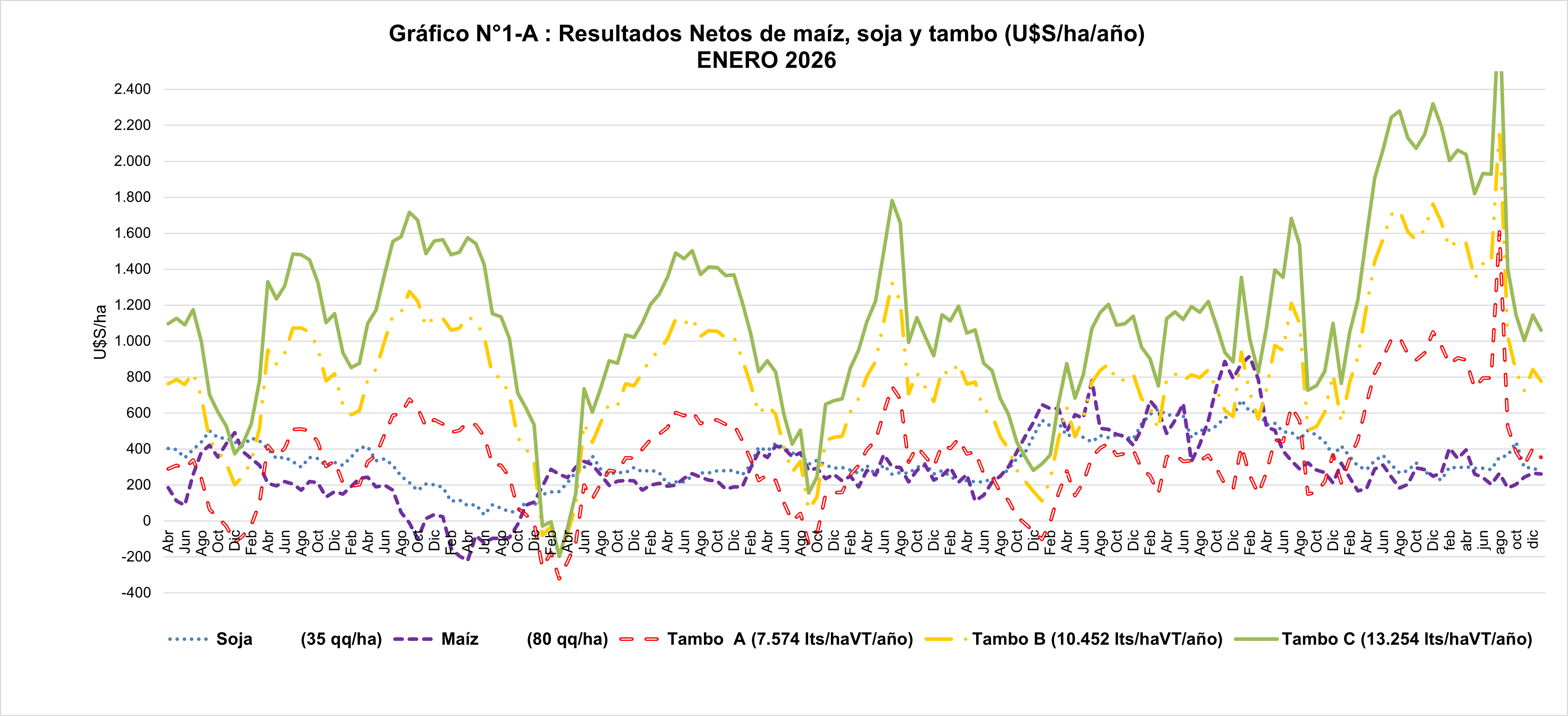 Como puede verse al final de este, el RN del tambo C (13.254 lts/haVT/año) fue 5 veces el RN del promedio de soja y maíz en el promedio de los últimos 24 meses. Y también 6,6 veces en el promedio los últimos 12 meses.