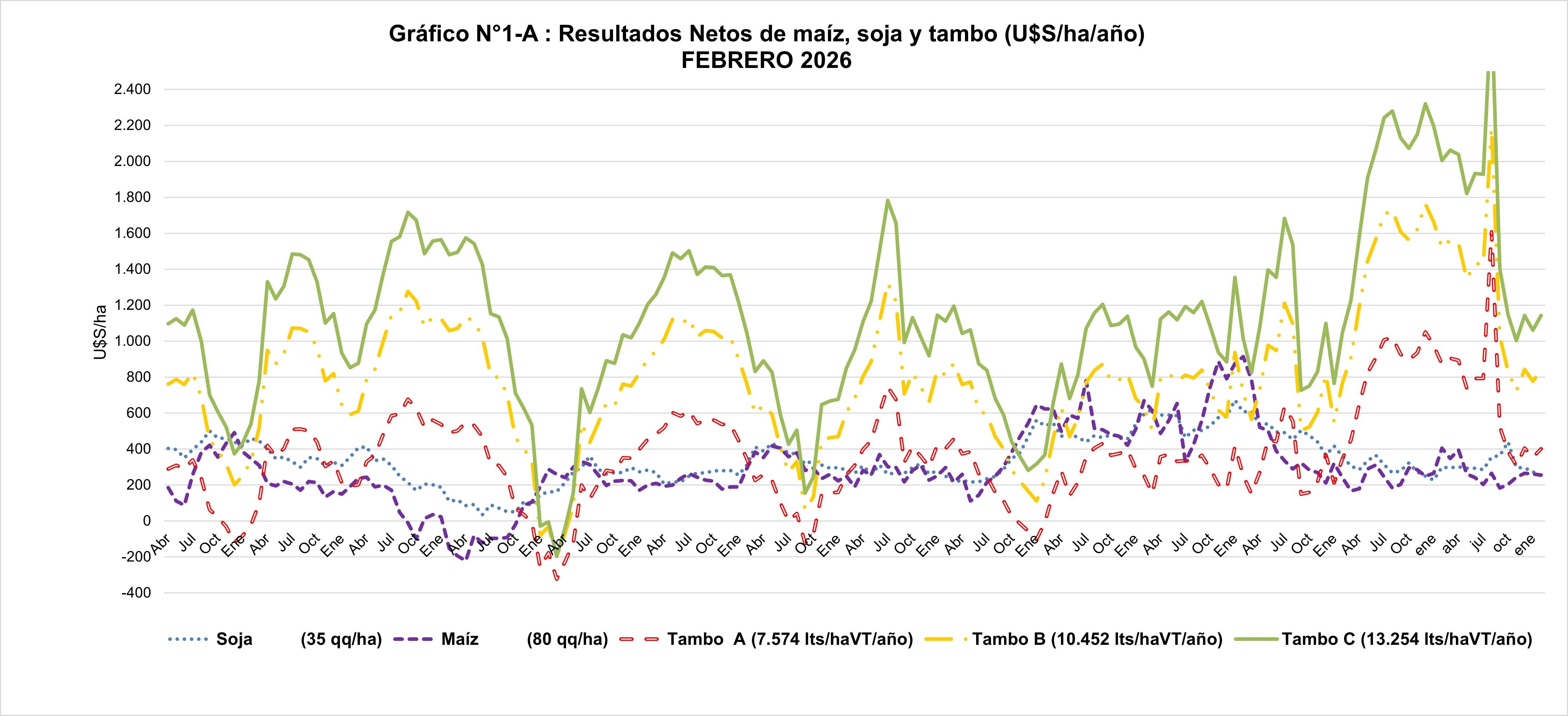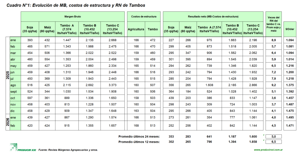 Como puede verse al final de este, el RN del tambo C (13.254 lts/haVT/año) fue 5 veces el RN del promedio de soja y maíz en el promedio de los últimos 24 meses. Y también 6.5 veces en el promedio los últimos 12 meses.