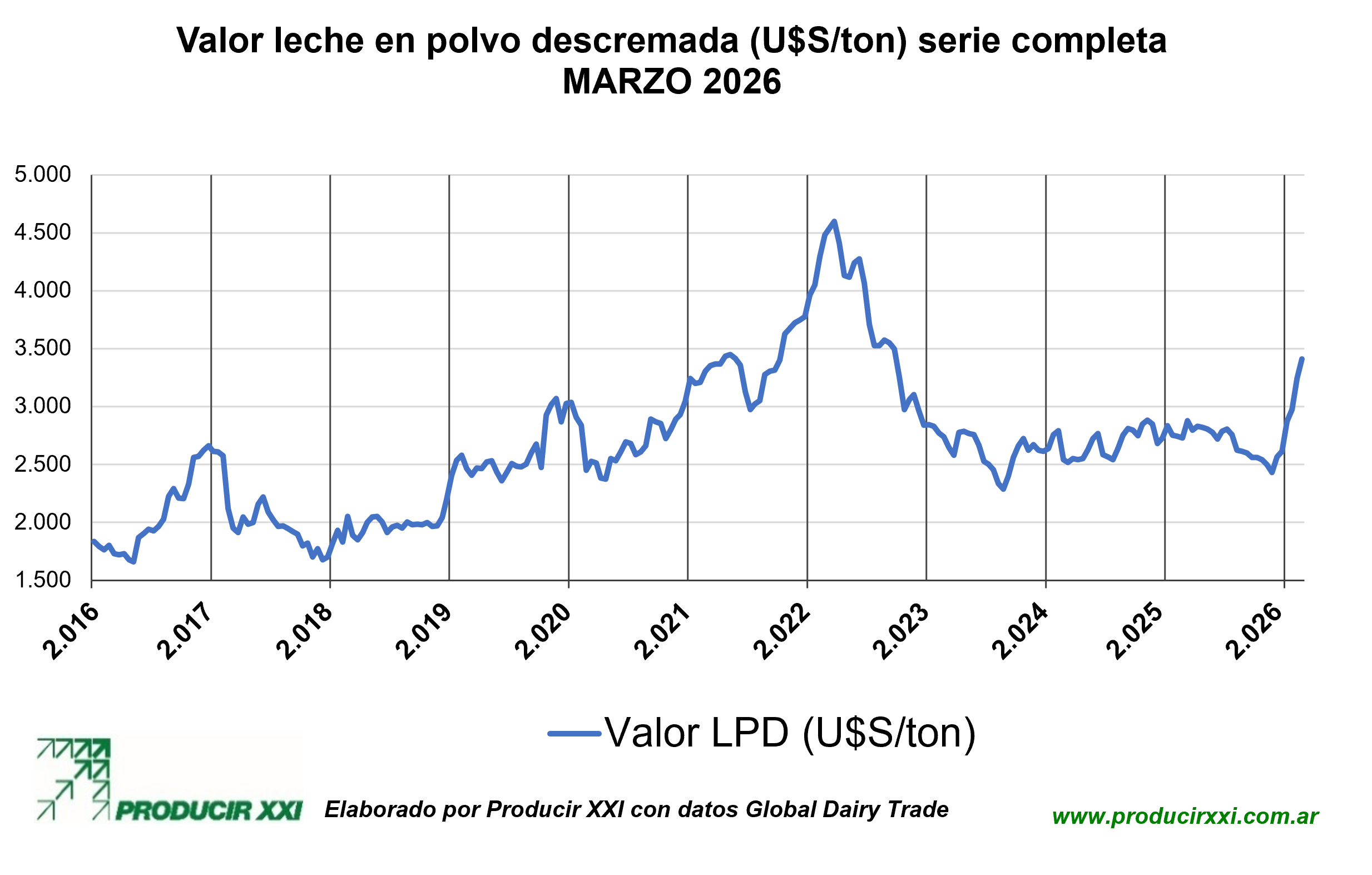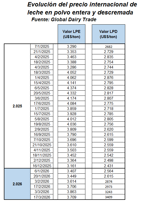 Estos gráficos representan la evolución del precio internacional de la leche en polvo entera y descremada, dos de los principales productos lácteos que exporta Argentina. Datos actualizados hasta el último evento.