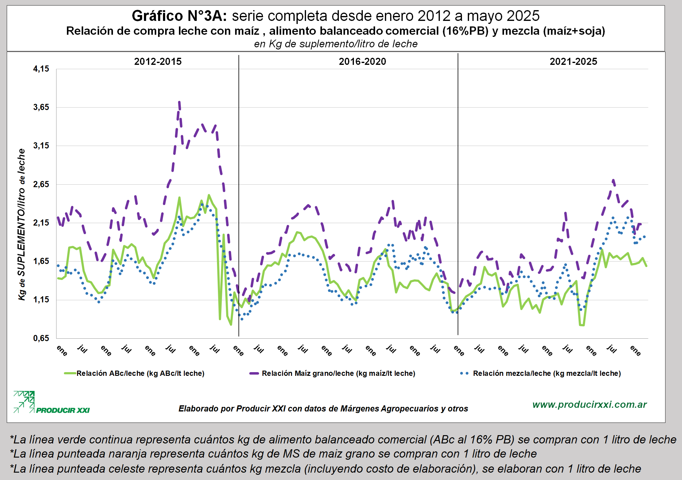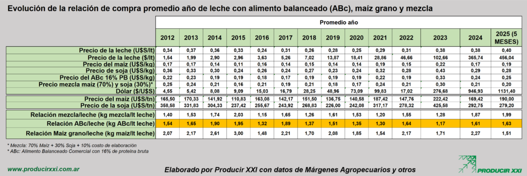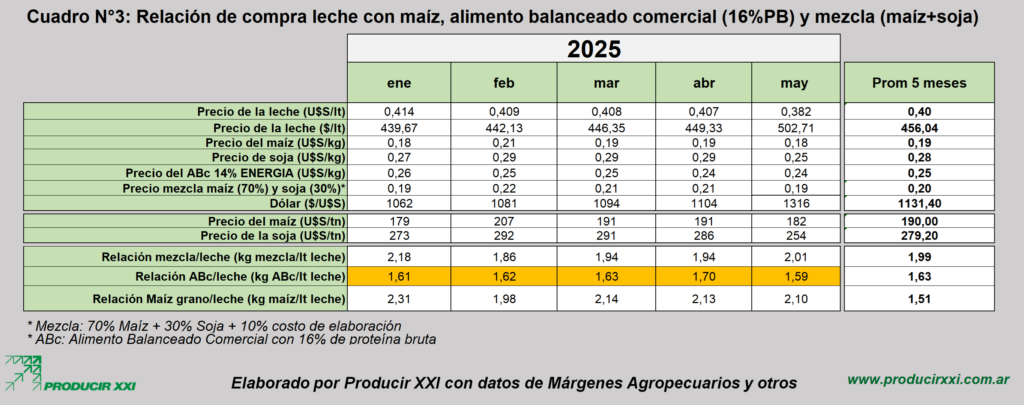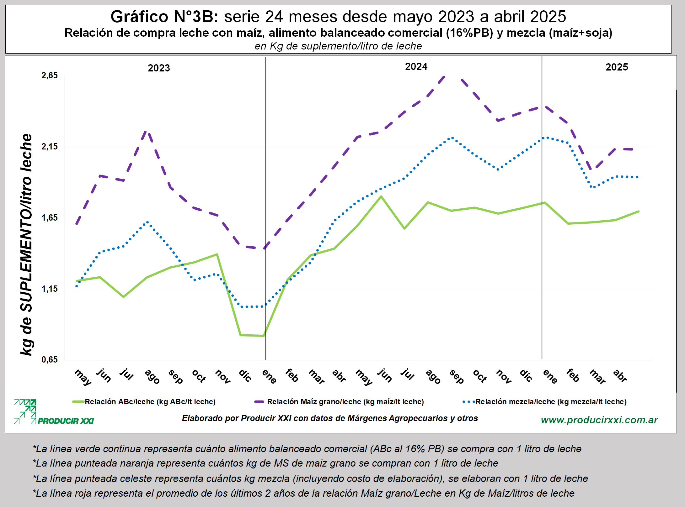 Este gráfico muestra la evolución de la capacidad de compra de diferentes concentrados con el valor de 1 litro de leche en tambo. Los concentrados considerados son grano de maíz a precio de compra en el mercado, Alimento Balanceado comercial (ABc) 16% PB y una mezcla de 70% de maíz y 30% de soja (más 10% por el costo de elaboración propia). Viendo este gráfico y su cuadro con valores, se aprecia una leve caída en la capacidad de compra respecto del mes de agosto. En mayo de 2025 se compran 2.10 kg de grano de maíz con el valor de 1 litro de leche; y 1,59 kg de ABc con el valor de 1 litro de leche.